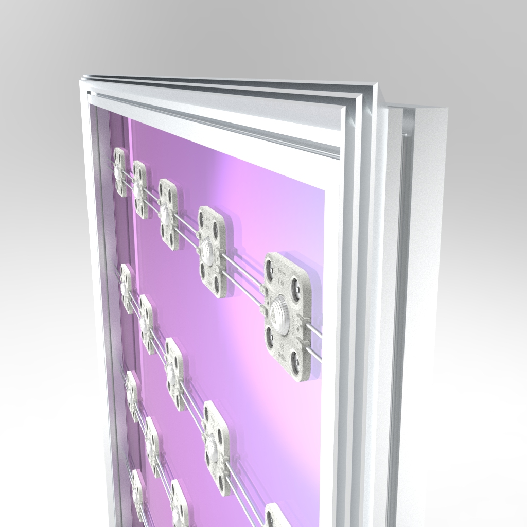 Größe der Textilgrafik: Rahmengröße + umlaufend 1cm Motivzugabe für Flachkeder (zB. 102x102cm bei Rahmengröße 100x100cm) Gewicht: Aluminium Profil 1,8 kg/lfm / Textil 0,23 kg/qm Spezic: 500/6740-0,580 LED MATRIX 8/8F10 /ALF
